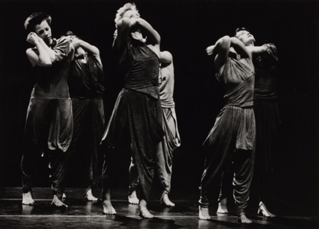 Foto fra Filo d’Erba or Frail Creation, 1989, koreografi: Giorgio Rossi for Collage Dansekompani, fotograf: Erik Berg, avbildede fra venstre: Cecilie Lindeman Steen, Aase With, Nina Ly, Kristina Gjems (delvis skjult), Cathrine Smith og Mona Walderhaug, Collage Dansekompani, Dansearkivet ved Danseinformasjonen.