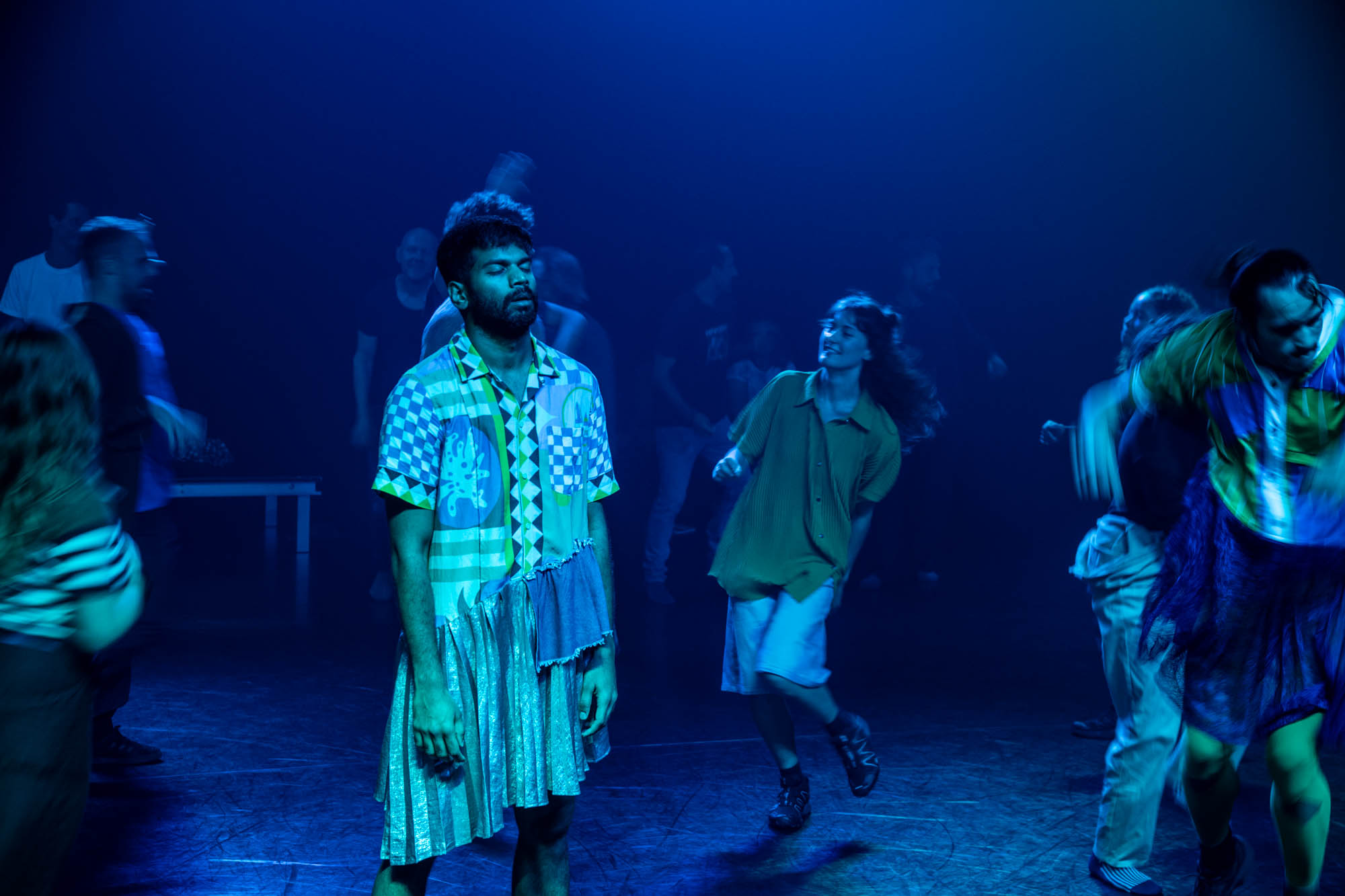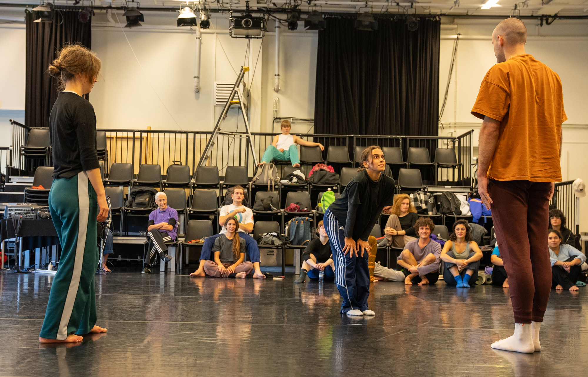 It starts with an accumulation of ideas, where a wide range of movements and materials are allowed to surface, creating a layering of scenes. Early run-throughs can last up to three hours. From this raw material, he starts to “peel off” layers to reduce it to its core. Inspired by the American writer Raymond Carver, Scavetta enjoys removing elements until only the essential is left: if you remove even just one word, the story is not there anymore.