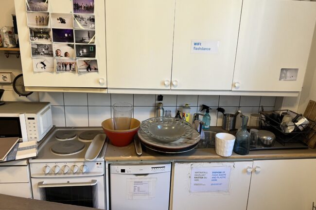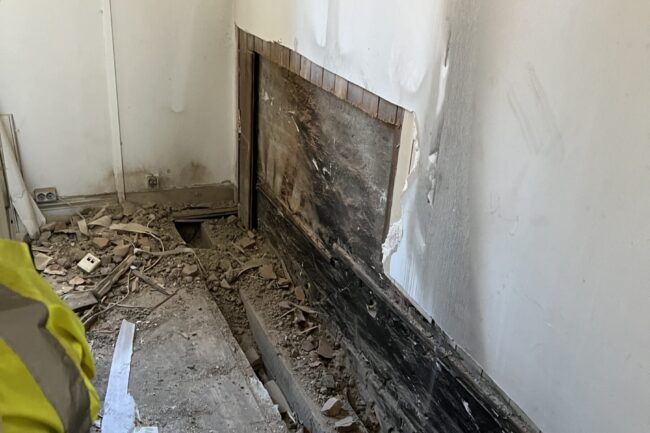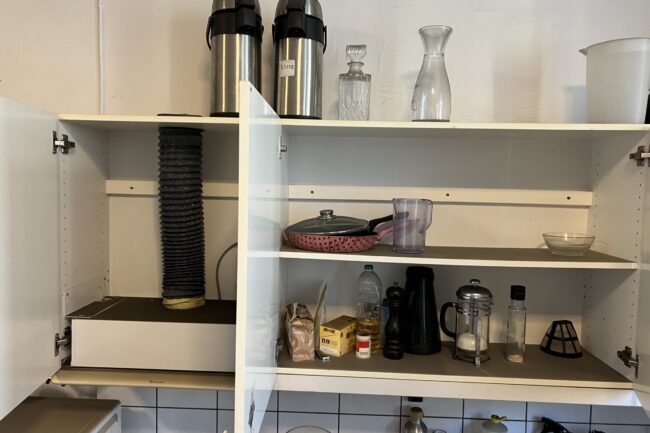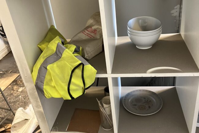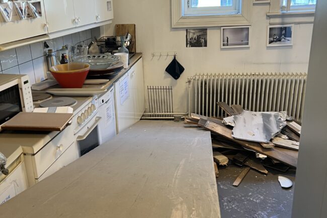 Så langt har det ikke blitt påvist direkte brannskader på våre lokaler, men dette blir fortsatt utredet ettersom det brant heftig i himlingen i etasjen under. Det vi kan fortelle er at deler av kjøkkengulvet er revet opp og det ligger et tykt lag av sot over alt. Saneringsfirma er i gang og det er en omfattende jobb å få fjernet støvet som ligger i tykke lag over hele lokalet; på gulv, vegger, inne i skap og skuffer – over alt. Heldigvis er det ikke påvist noen varige eller strukturelle skader på selve bygningen.